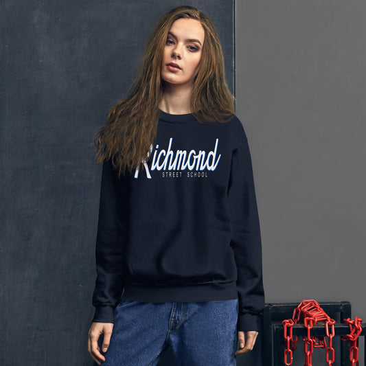 This design brings a nostalgic 1990s flair with its bold, retro script. The word "Richmond" is written in a flowing, dynamic cursive font, evoking a sense of classic cool and timeless style. The text is outlined in white with a subtle drop shadow effect, adding dimension and making the lettering pop against the dark background. Beneath "Richmond," the words "Street School" appear in smaller, simple block letters, balancing the overall design with a modern touch. This clean and stylish look blends old-school charm with contemporary minimalism, perfect for those who love a mix of vintage and modern aesthetics.
