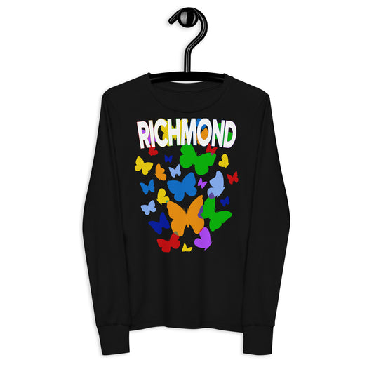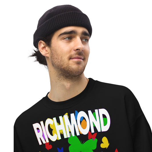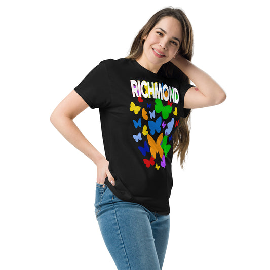 This vibrant design bursts with color and energy, featuring a flurry of butterflies in a rainbow of shades. The butterflies radiate outward from the center, creating a dynamic and joyful sense of movement. At the top, "Richmond" is written in bold, multicolored block letters, perfectly complementing the lively butterflies below. The playful mix of hues gives the design a whimsical, uplifting feel, symbolizing transformation, diversity, and freedom. This bold and eye-catching look is ideal for anyone who loves a fun, expressive design full of color and positivity.