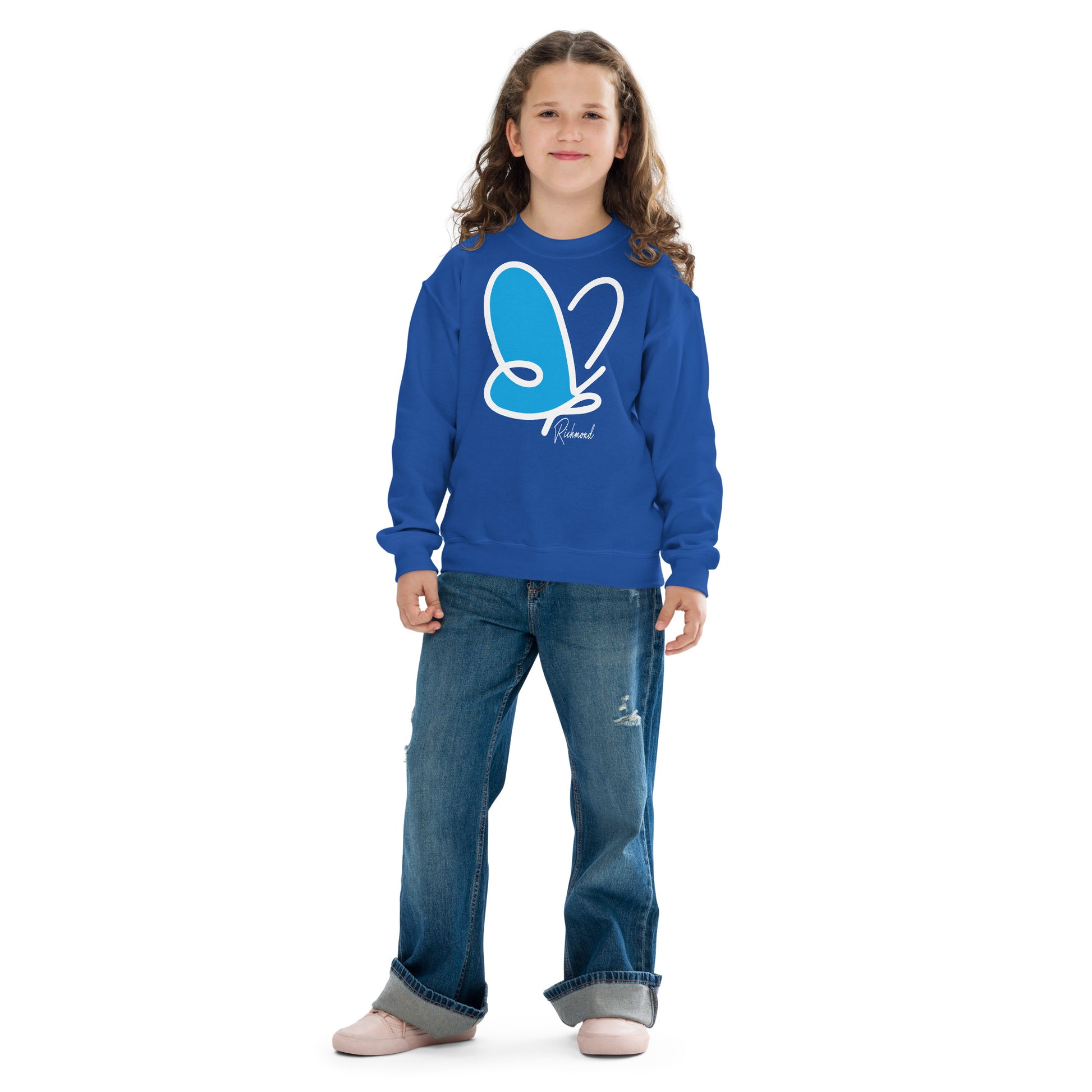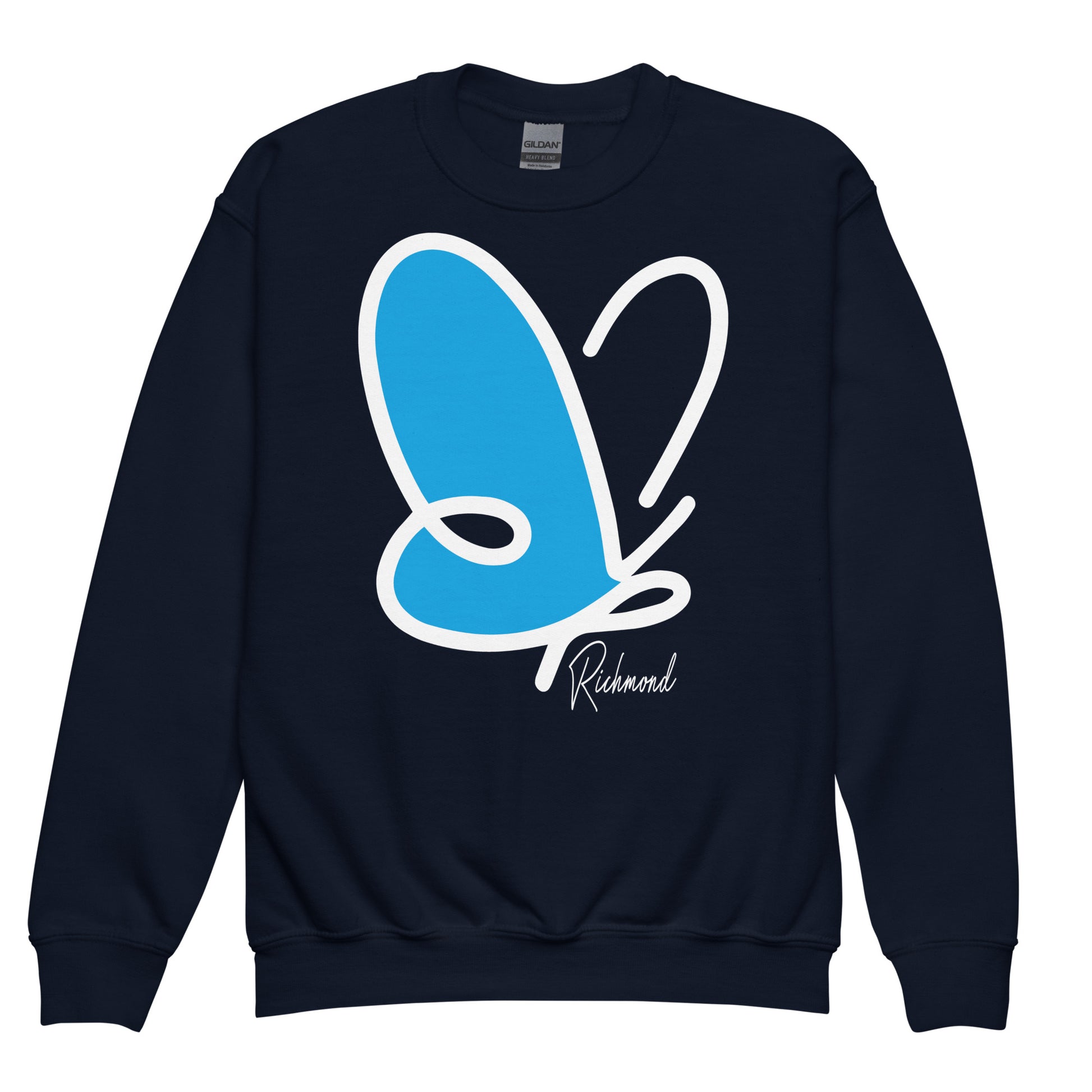 This design features a bold, minimalist butterfly crafted with smooth, sweeping lines. The butterfly's wings are formed by a large, vibrant blue shape outlined in white, creating a striking contrast against the background. Its simple yet artistic form evokes a sense of elegance and modernity, while maintaining a playful, creative energy. The word "Richmond" is delicately written in a subtle cursive at the bottom, adding a touch of sophistication without overpowering the central image. This clean and stylish design makes a statement with its graceful lines, perfect for those who love artful simplicity and bold colors.