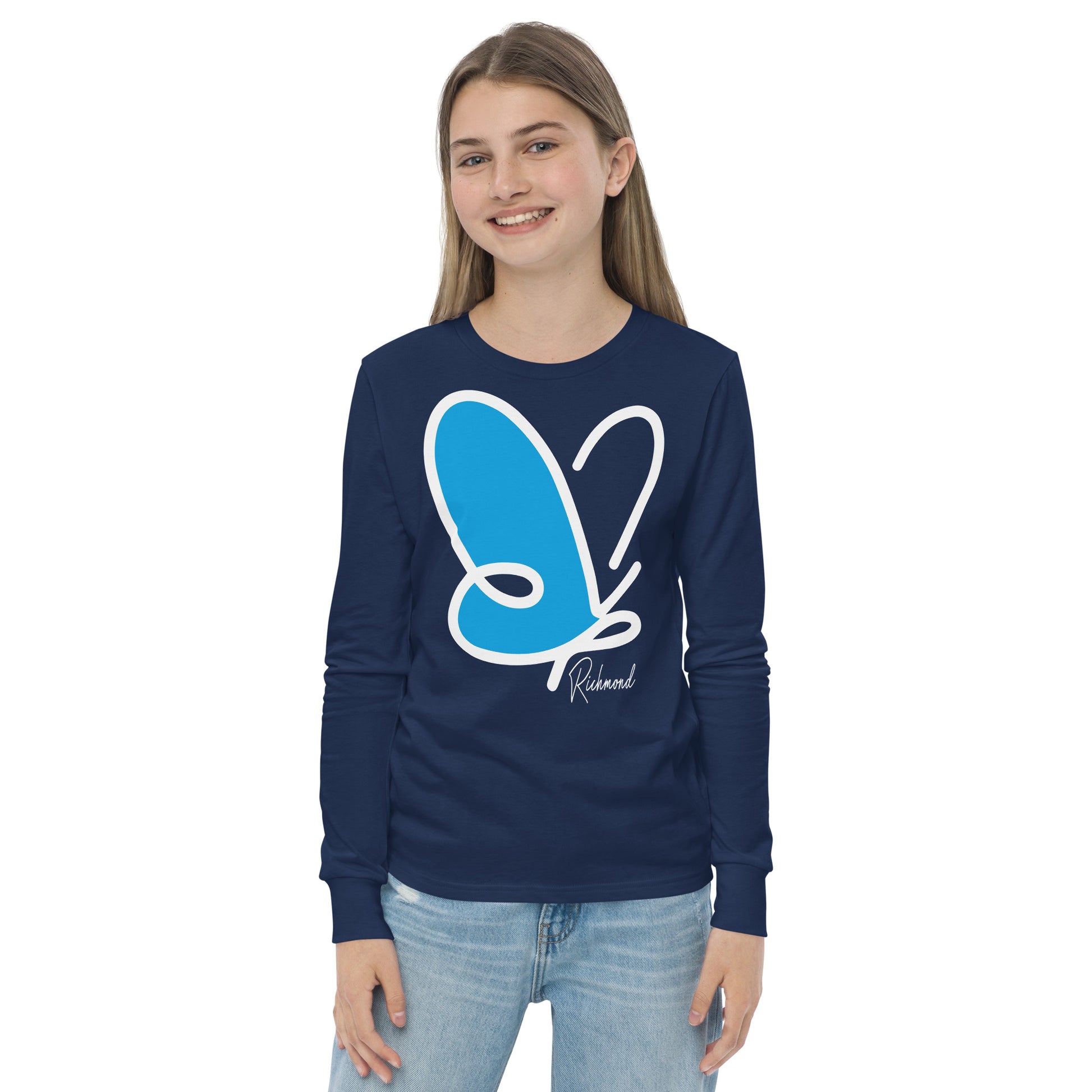 This design features a bold, minimalist butterfly crafted with smooth, sweeping lines. The butterfly's wings are formed by a large, vibrant blue shape outlined in white, creating a striking contrast against the background. Its simple yet artistic form evokes a sense of elegance and modernity, while maintaining a playful, creative energy. The word "Richmond" is delicately written in a subtle cursive at the bottom, adding a touch of sophistication without overpowering the central image. This clean and stylish design makes a statement with its graceful lines, perfect for those who love artful simplicity and bold colors.
