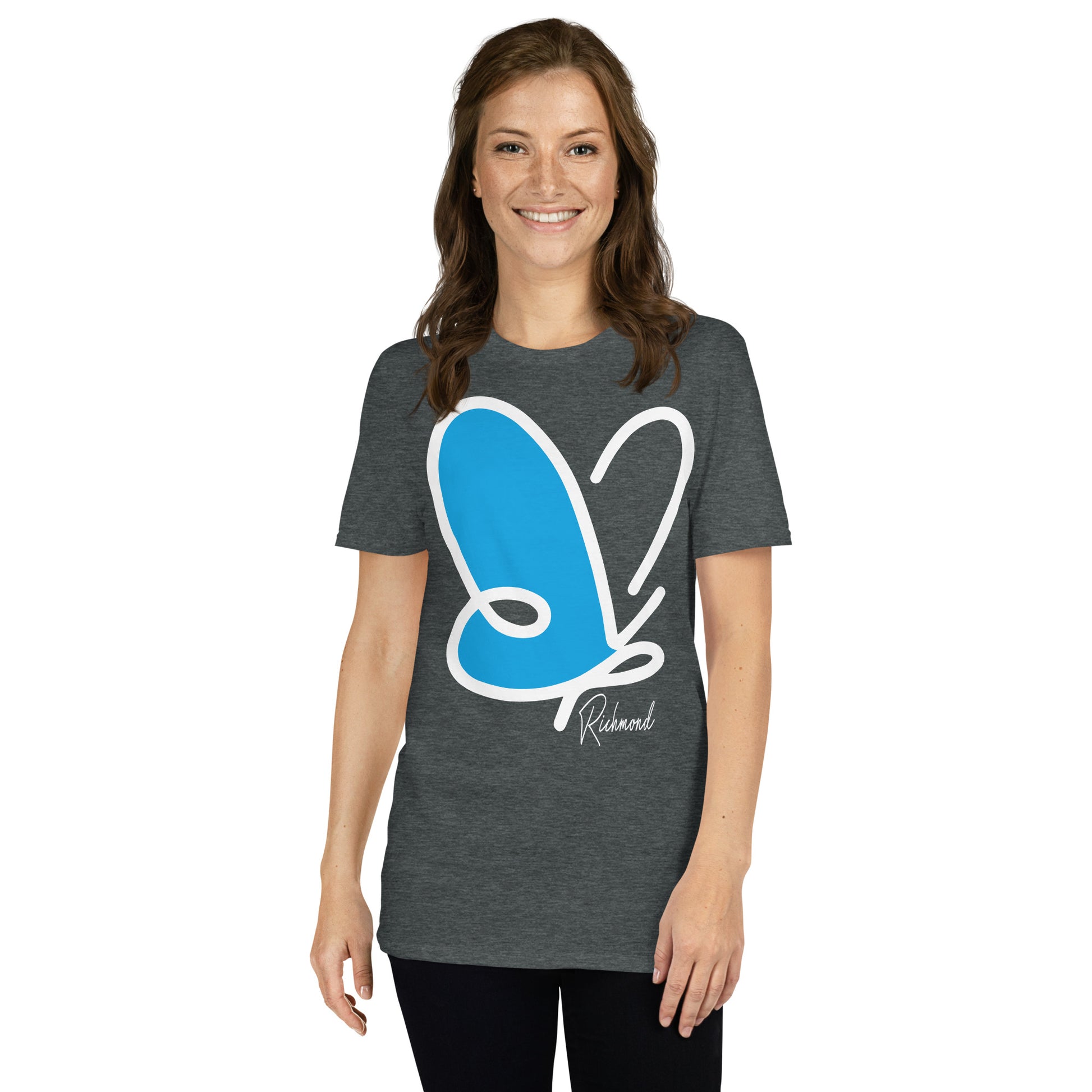 This design features a bold, minimalist butterfly crafted with smooth, sweeping lines. The butterfly's wings are formed by a large, vibrant blue shape outlined in white, creating a striking contrast against the background. Its simple yet artistic form evokes a sense of elegance and modernity, while maintaining a playful, creative energy. The word "Richmond" is delicately written in a subtle cursive at the bottom, adding a touch of sophistication without overpowering the central image. This clean and stylish design makes a statement with its graceful lines, perfect for those who love artful simplicity and bold colors.