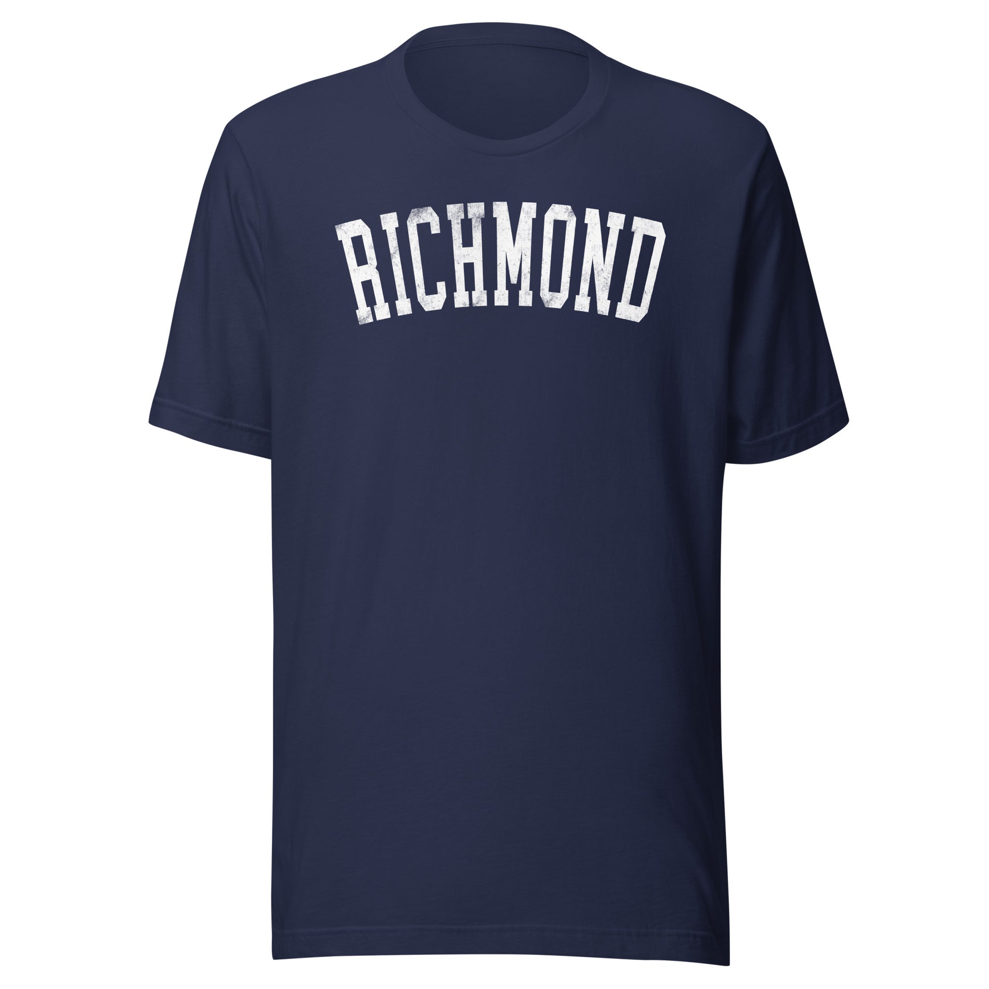 Show off classic, timeless style with this Richmond design. Featuring the word "Richmond" boldly displayed across the chest in large, arched block letters, the design evokes a vintage collegiate vibe. The slightly distressed texture of the white lettering adds a worn-in, retro feel, giving it character and charm. The minimalistic yet bold design focuses on simplicity, letting the school name take center stage.