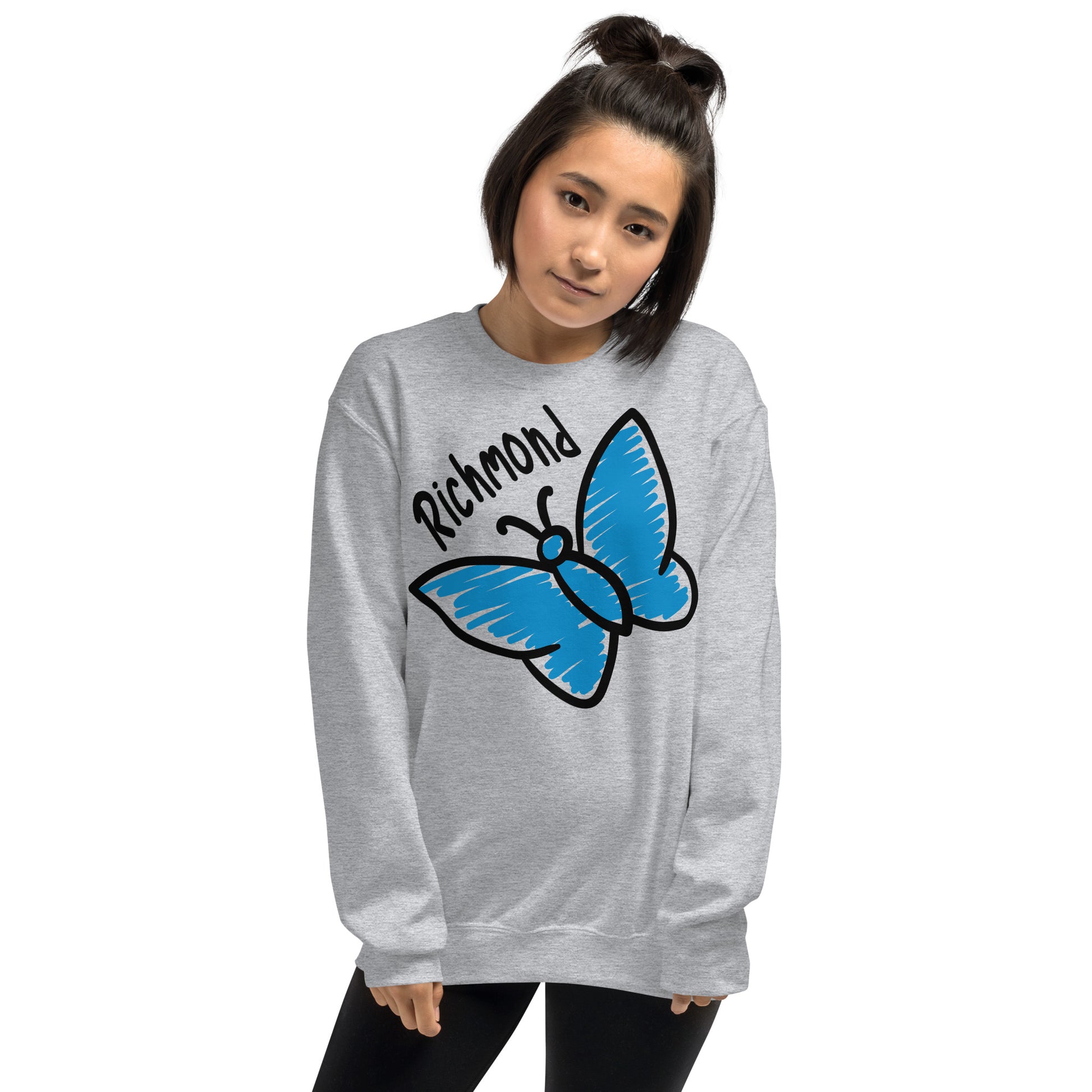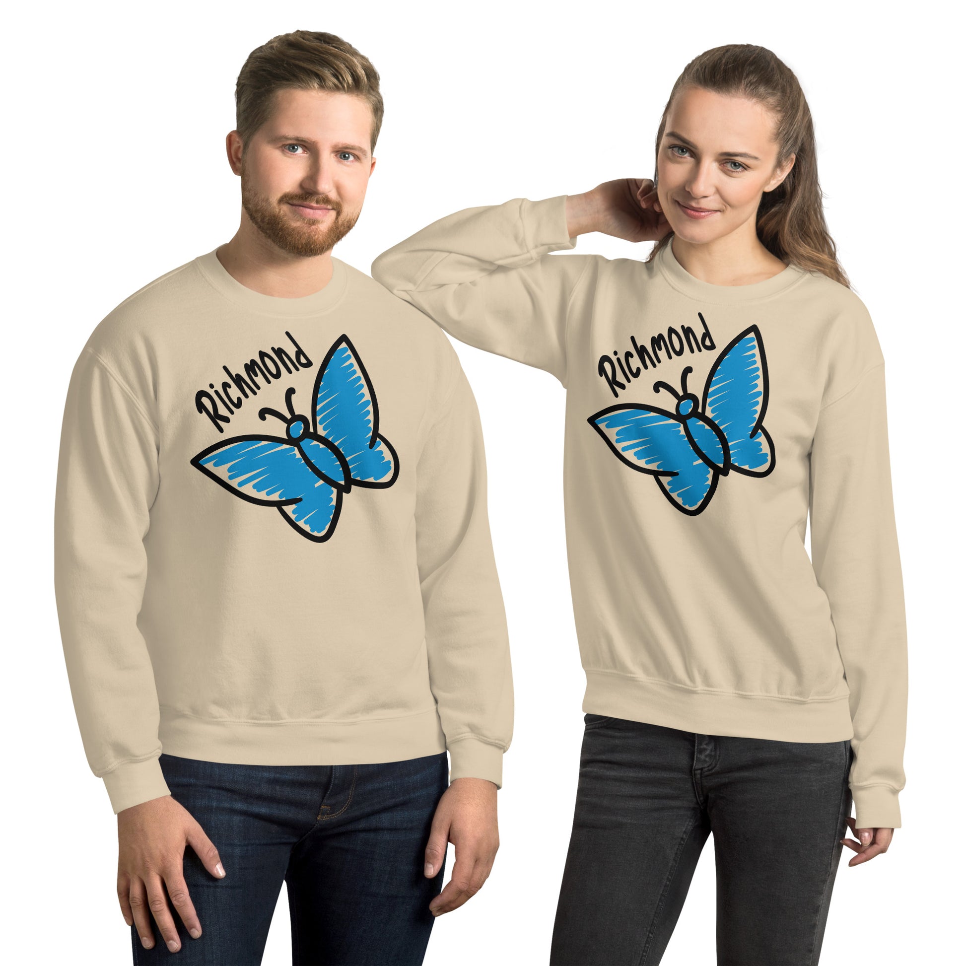 Celebrate bold and playful style with this standout Richmond butterfly design. Featuring a large, hand-drawn blue butterfly in the center, the design adds a whimsical touch, filled with simple yet striking details. The thick black outline gives the butterfly a pop-art feel, while the vibrant marker blue color brings energy and charm to the piece. Above the butterfly, "Richmond" is written in a fun, casual font, complementing the youthful and carefree vibe of the overall design. Perfect for anyone wanting to add a splash of personality to their wardrobe, this design captures the spirit of adventure and creativity.