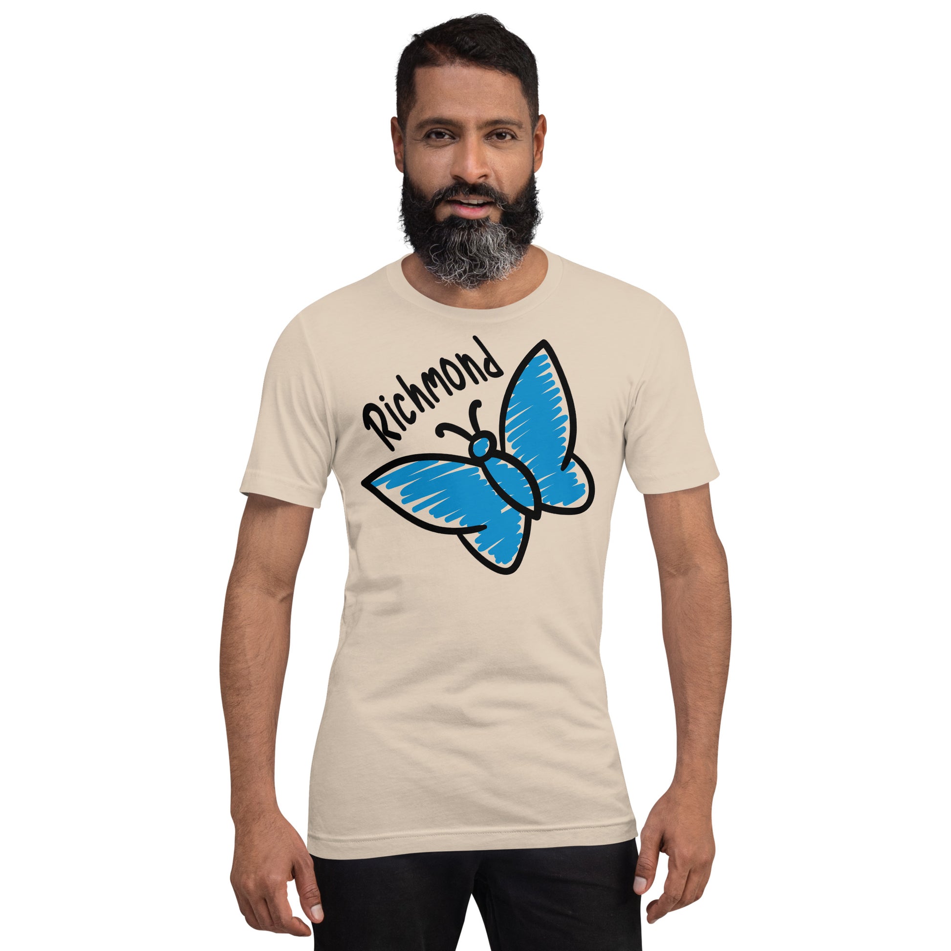 Celebrate bold and playful style with this standout Richmond butterfly design. Featuring a large, hand-drawn blue butterfly in the center, the design adds a whimsical touch, filled with simple yet striking details. The thick black outline gives the butterfly a pop-art feel, while the vibrant marker blue color brings energy and charm to the piece. Above the butterfly, "Richmond" is written in a fun, casual font, complementing the youthful and carefree vibe of the overall design. Perfect for anyone wanting to add a splash of personality to their wardrobe, this design captures the spirit of adventure and creativity.