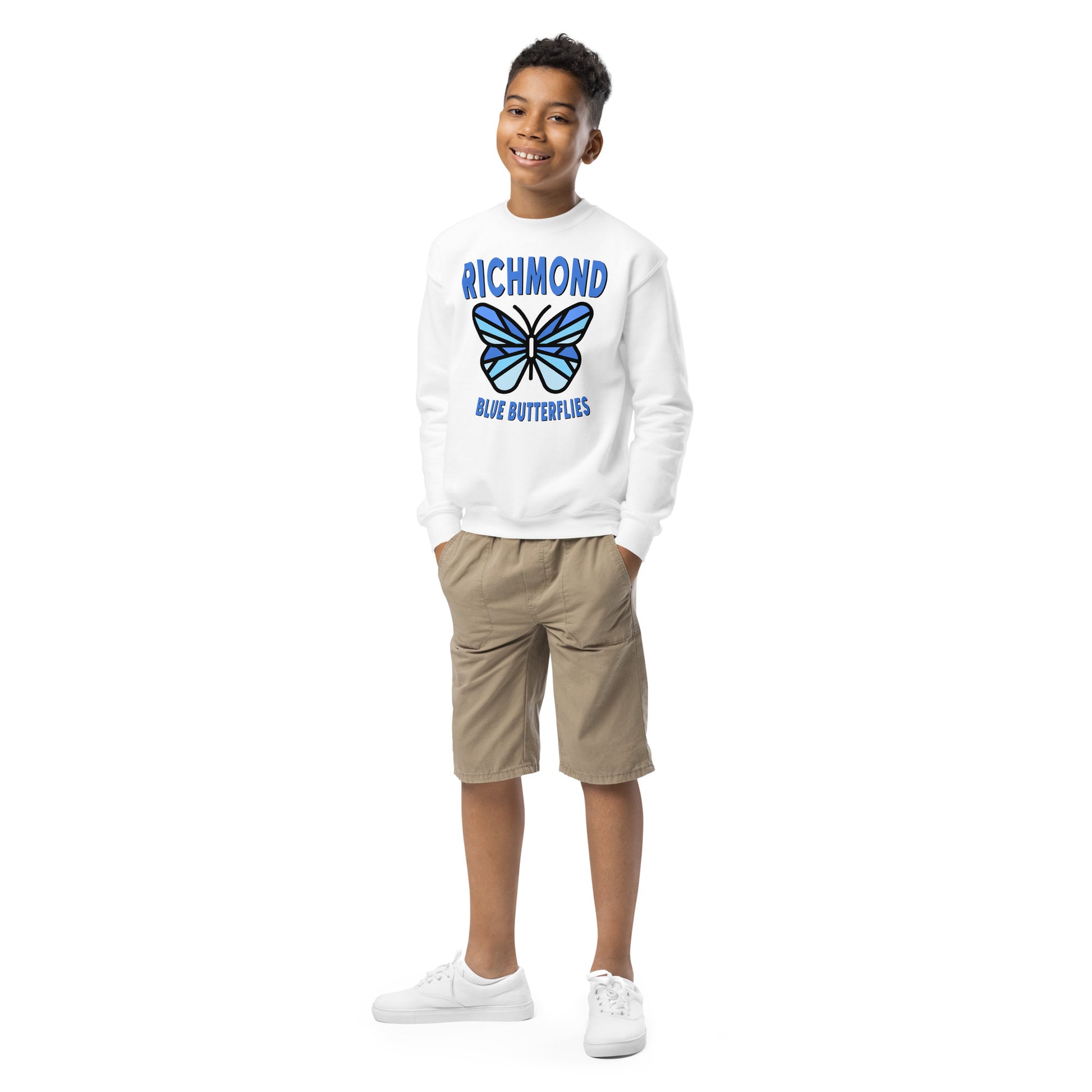 This design showcases a bold and vibrant butterfly at the center, colored in shades of blue with thick black outlines, creating a striking visual contrast. Above the butterfly, the word "Richmond" is displayed in large, curved block letters, with "Blue Butterflies" arched below, creating a cohesive and balanced layout. The butterfly design is stylized with geometric sections, giving it a stained-glass-like effect that adds depth and dimension. The combination of strong typography and the dynamic butterfly illustration makes this design both eye-catching and playful, perfect for celebrating Richmond with a bright, uplifting vibe.