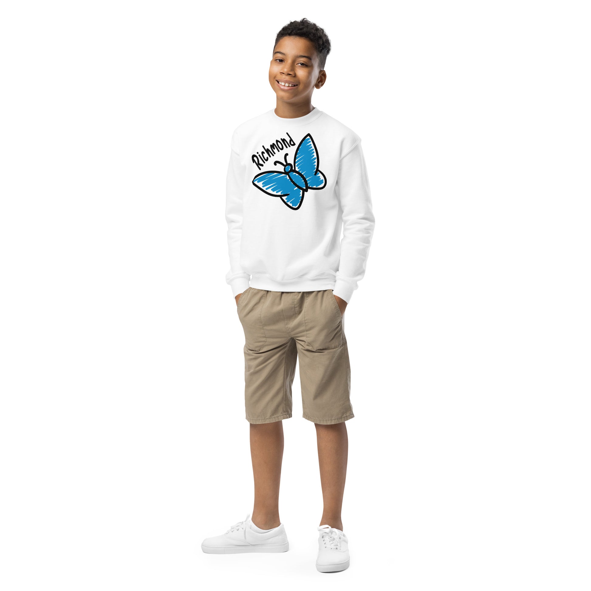 Celebrate bold and playful style with this standout Richmond butterfly design. Featuring a large, hand-drawn blue butterfly in the center, the design adds a whimsical touch, filled with simple yet striking details. The thick black outline gives the butterfly a pop-art feel, while the vibrant marker blue color brings energy and charm to the piece. Above the butterfly, "Richmond" is written in a fun, casual font, complementing the youthful and carefree vibe of the overall design. Perfect for anyone wanting to add a splash of personality to their wardrobe, this design captures the spirit of adventure and creativity.